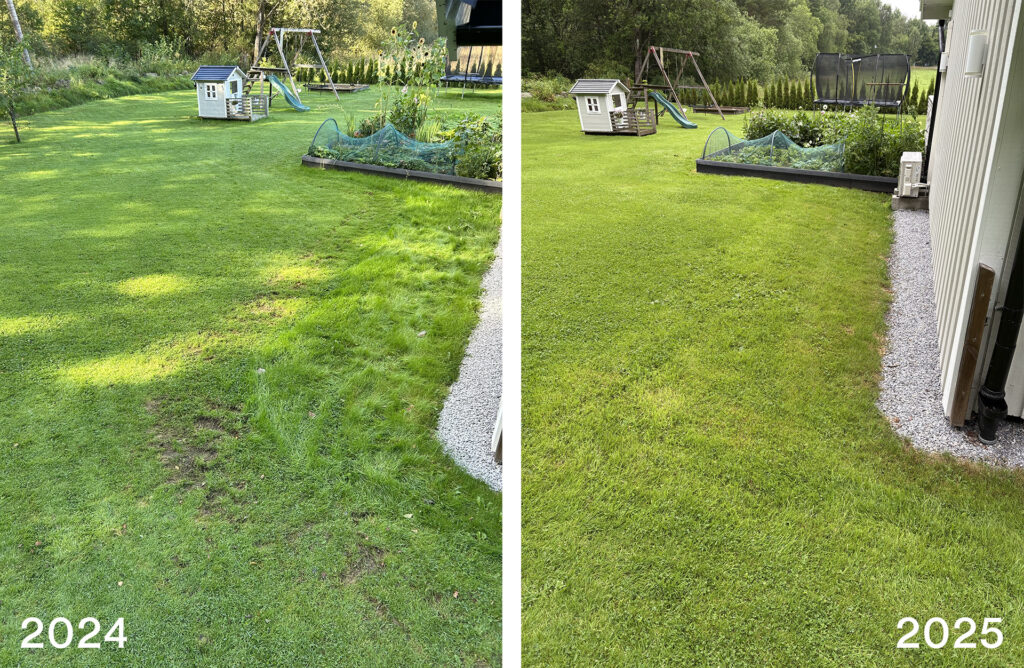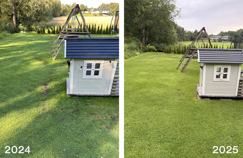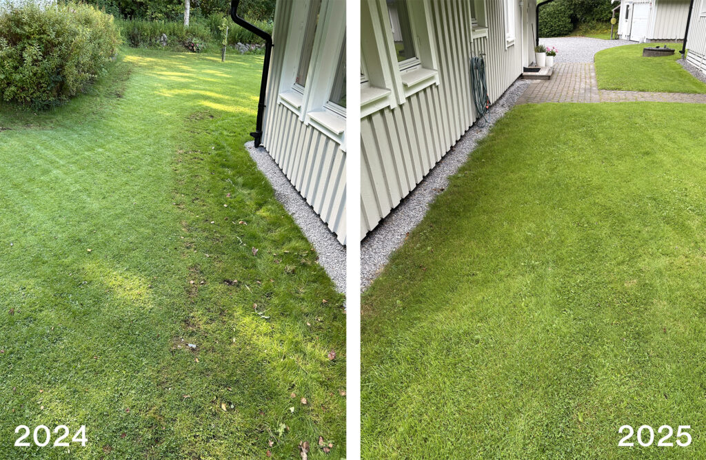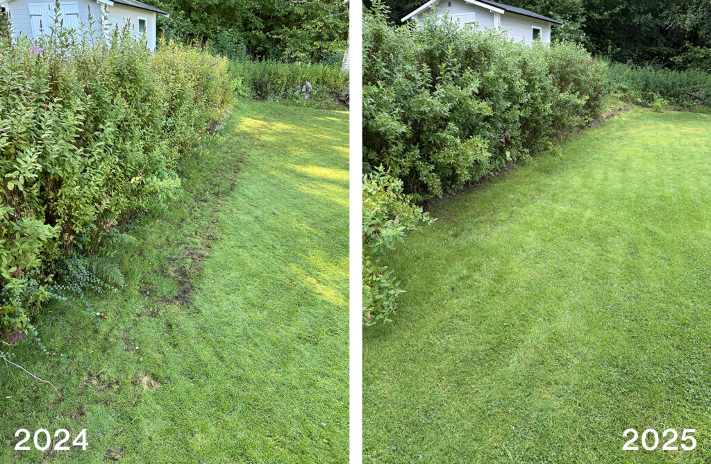 Det ska sägas att jag lägger minimalt med tid på min gräsmatta. Jag gödslar inte. Jag stödsår inte. Jag går på den, spelar lite fotboll med barnen och jag tittar på den när den ligger framför mig. Inte mer än så. Om det är klöver eller gräs spelar inte jättemycket roll, så länge det är grönt om man kisar. Hade jag skött den så hade det nog inte funnits några spår kvar efter förra sommarens massaker. Jag har inte moddat gräsklipparen med extra vikt baktill som jag sett att andra gör. Är dock sugen på att testa för att se om det gör någon skillnad, för den slirar såklart fortfarande ibland.